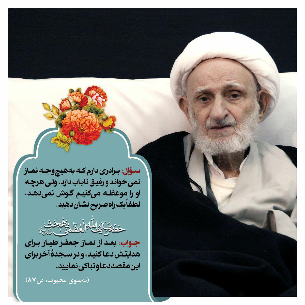 حضرت آیت الله بهجت قدس سره : بعد از نماز جعفر طیار برای هدایتش دعا کنید، و در سجدۀ آخر برای این مقصد دعا و تباکی نمایید.
