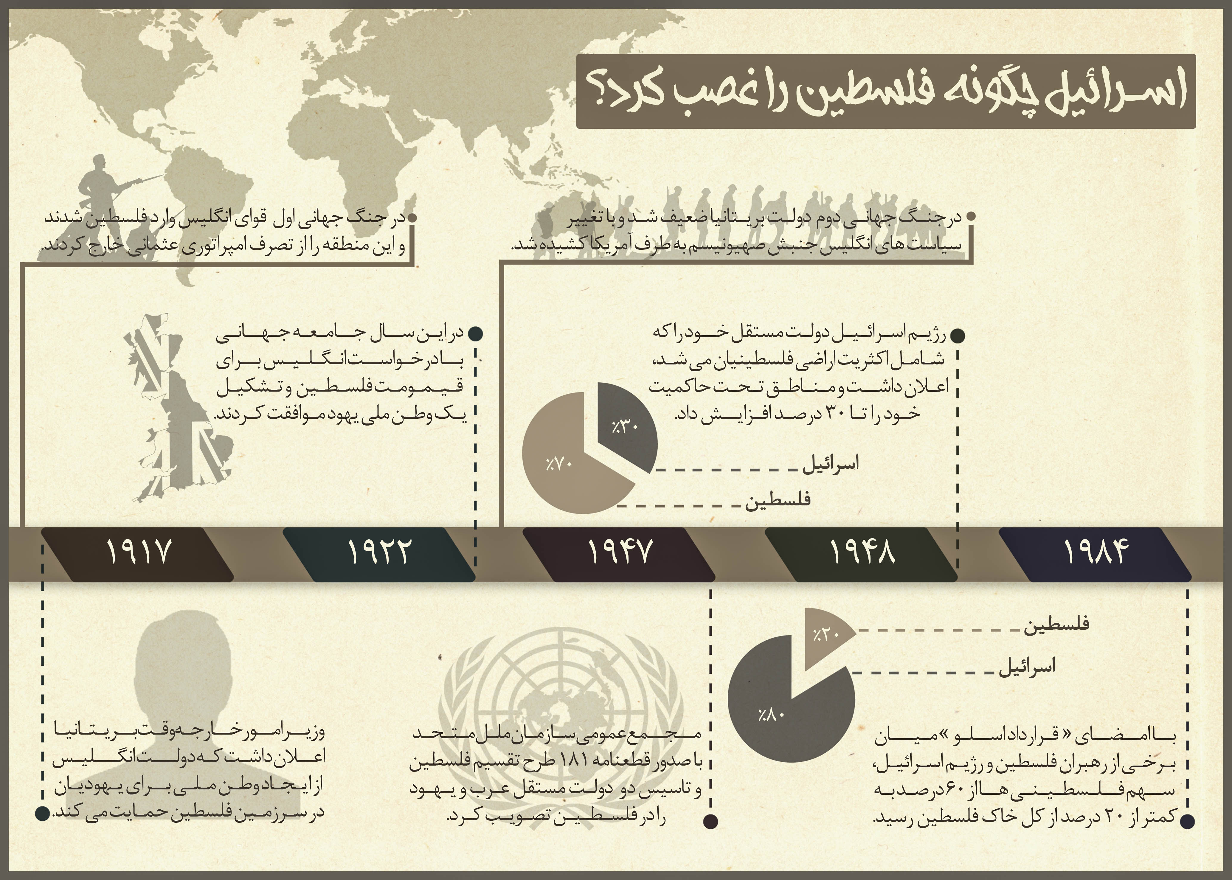 ◇ در این تایم لاین به چگونگی اشغال سرزمینهای اشغالی فلسطین به دست رژیم غاصب صهیونیستی خلال سالهای ۱۹۱۷ تا ۱۹۸۴ میلادی پرداخته شده است.