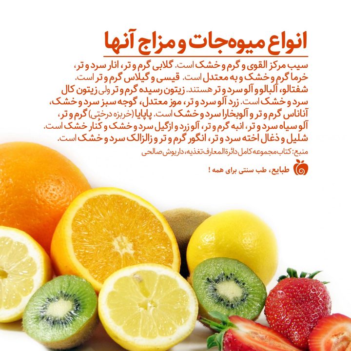 آلبالو: مزاج سرد و خشک - انجیر: مزاج گرم و تر - انگور: مزاج گرم و تر - گلابی: مزاج معتدل مایل به گرمی - هلو: مزاج سرد و تر - زردآلو: مزاج سرد و تر - خربزه: مزاج گرم و تر - هنداونه: سرد و تر