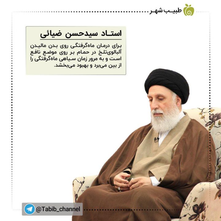 از نظر استاد ضیائی : برای درمان ماه گرفتگی روی بدن مالیدن آلبالوی تلخ در حمام به بدن، برای از بین بردن سیاهی ماه گرفتگی نافع است و به مرور بهبود می دهد.