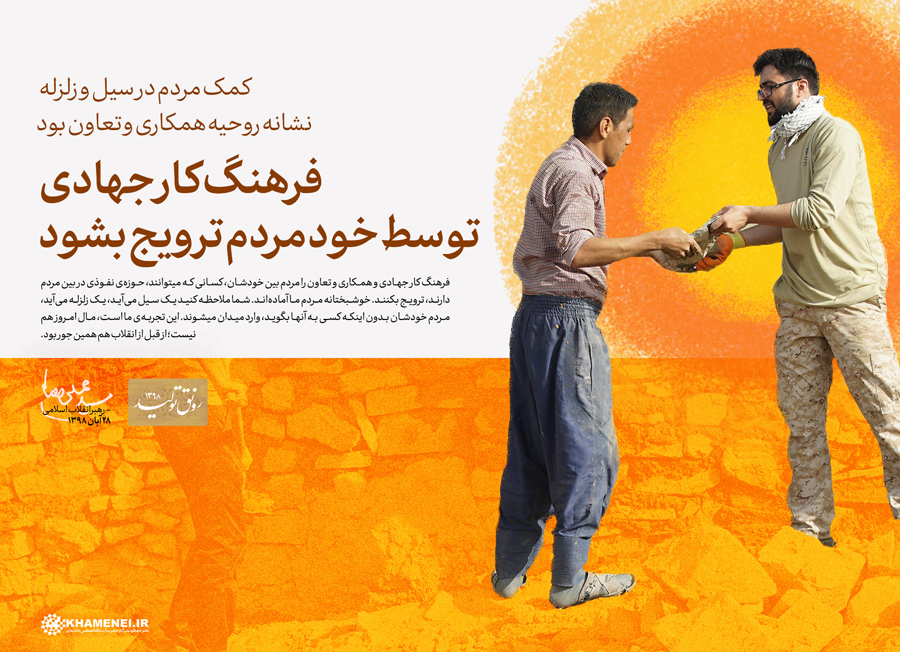 فرهنگ کار جهادی و همکاری و تعاون را مردم بین خودشان، کسانی که میتوانند، حوزه نفوذی در بین مردم دارند، ترویج بکنند. خوشبختانه مردم ما آماده اند. شما ملاحظه کنید یک سیل می آید، یک زلزله می آید، مردم خودشان بدون اینکه کسی به آنها بگوید، وارد میدان میشوند. این تجربه ما است، مال امروز هم نیست؛ از قبل از انقلاب هم همین جور بود.