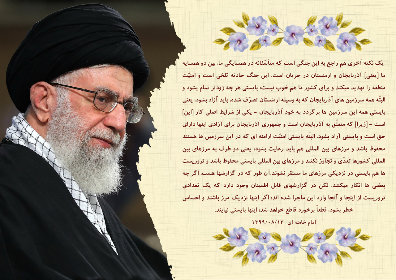 مقام معظم رهبری مدظله العالی : یک نکته آخری هم راجع به این جنگی است که متأسّفانه در همسایگی ما، بین دو همسایه ما [یعنی] آذربایجان و ارمنستان در جریان است. این جنگ حادثه تلخی است و امنیّت منطقه را تهدید میکند و برای کشور ما هم خوب نیست؛ بایستی هر چه زودتر تمام بشود و البتّه همه سرزمین های آذربایجان که به وسیله ارمنستان تصرّف شده، باید آزاد بشود؛ یعنی بایستی همه این سرزمین ها برگردد به خود آذربایجان -یکی از شرایطِ اصلیِ کار [این] است- [زیرا] که متعلّق به آذربایجان است و جمهوری آذربایجان برای آزادی اینها دارای حق است و بایستی آزاد بشود. البتّه بایستی امنیّت ارامنه ای که در این سرزمین ها هستند محفوظ باشد و مرزهای بین المللی هم باید رعایت بشود؛ یعنی دو طرف به مرزهای بین المللیِ کشورها تعدّی و تجاوز نکنند و مرزهای بین المللی بایستی محفوظ باشد و تروریست ها هم بایستی در نزدیکی مرزهای ما مستقر نشوند.آن طور که در گزارشها هست، اگر چه بعضی ها انکار میکنند، لکن در گزارشهای قابل اطمینان وجود دارد که یک تعدادی تروریست از اینجا و آنجا وارد این ماجرا شده اند؛ اگر اینها نزدیک مرز باشند و احساس خطر بشود، قطعاً برخورد قاطع خواهد شد؛ اینها بایستی نیایند... [بیانات بیانات رهبری به مناسبت سالروز ولادت پیامبر اعظم و امام صادق علیهماالسلام 1442 - 1399/08/13]