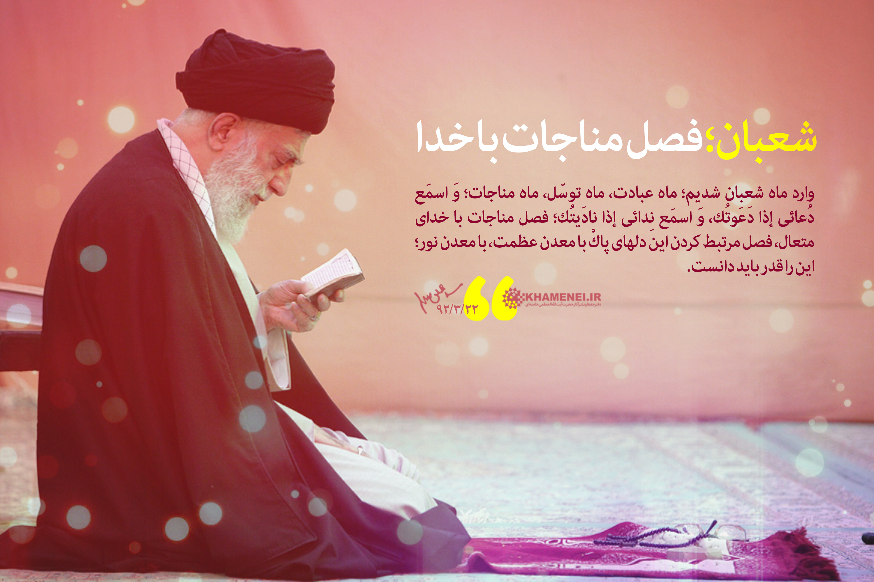 - «ما وارد ماه شعبان شدیم؛ ماه عبادت، ماه توسّل، ماه مناجات؛ وَ اسمَع دُعائی اِذا دَعَوتُک، وَ اسمَع نِدائی اِذا نادَیتُک؛ فصل مناجات با خدای متعال، فصل مرتبط کردن این دلهای پاکْ با معدن عظمت، با معدن نور؛ این را قدر باید دانست. این مناجات شعبانیّه یک تحفهای است که در اختیار ما قرار داده شده است. خب ما دعا خیلی داریم، همهی این دعاها هم پر از مضامین عالی است، امّا بعضی یک برجستگی خاصّی دارند... ماه شعبان یک چنین ماهی است؛ دلهای پاک، دلهای نورانی، دلهای جوان، از این موقعیّت بهره بگیرند، استفاده کنند، رابطهتان را با خدا قوی کنید.» (۱۳۹۲/۳/۲۲)