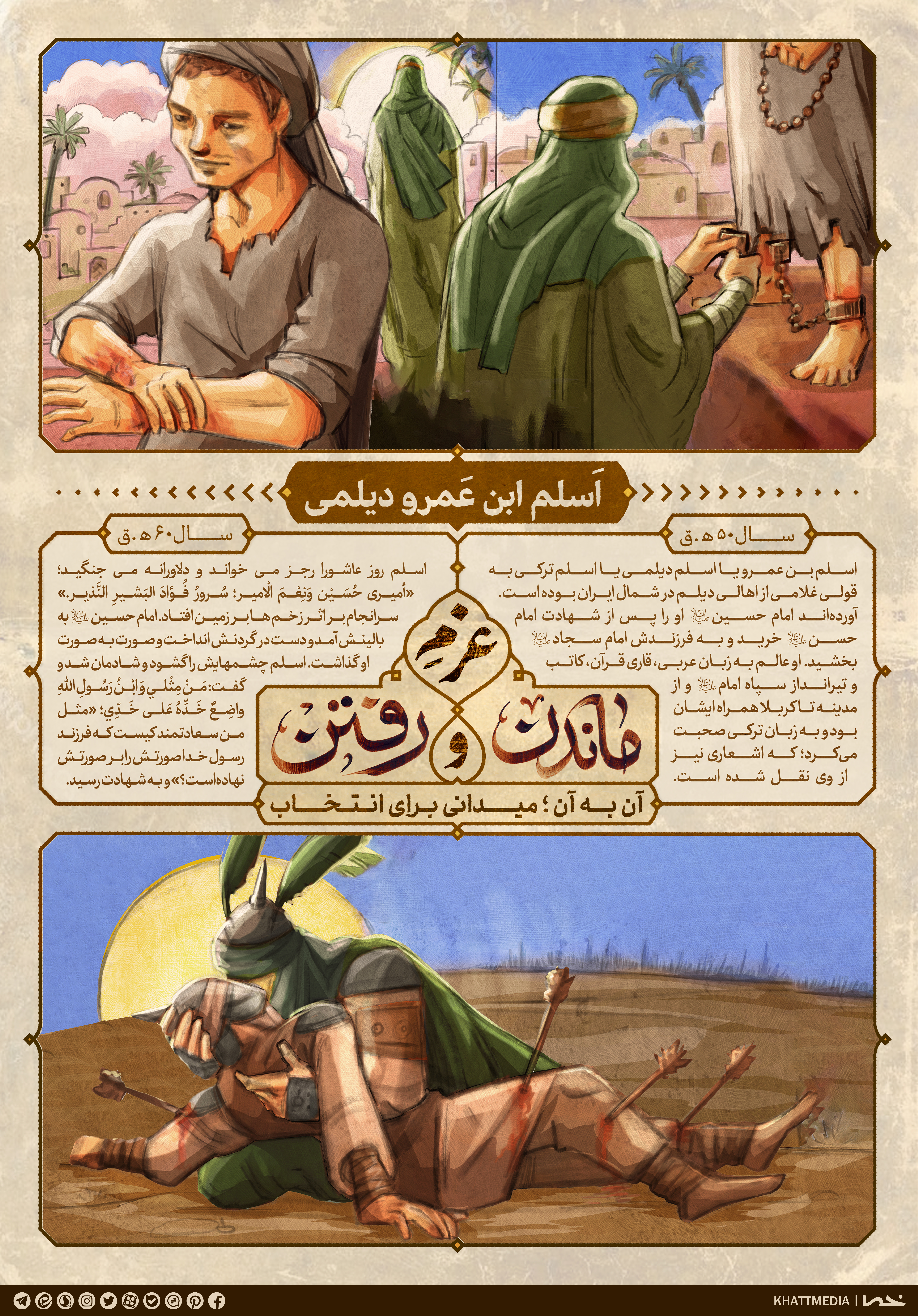 داستان مصور با عنوان عزم ماندن و رفتن به بررسی شخصیت های کربلا می پردازد. در این قسمت می خواهیم به شخصیت « اسلم ابن عمرو دیلمی » بپردازیم. برای دیدن سایر قسمت ها