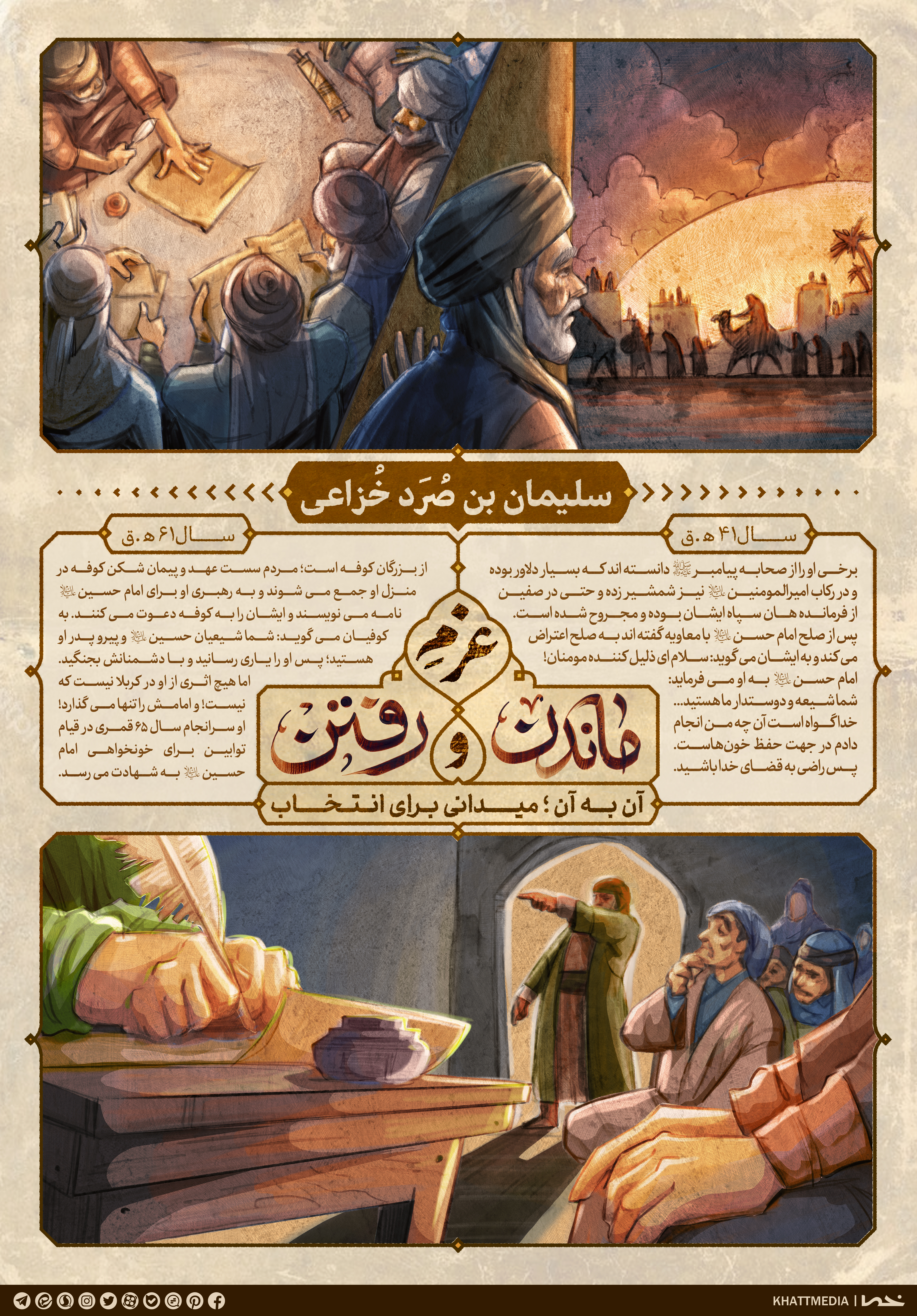 داستان مصور با عنوان عزم ماندن و رفتن به بررسی شخصیت های کربلا می پردازد. در این قسمت می خواهیم به شخصیت « سلیمان بن صرد خزاعی » بپردازیم. برای دیدن سایر قسمت ها