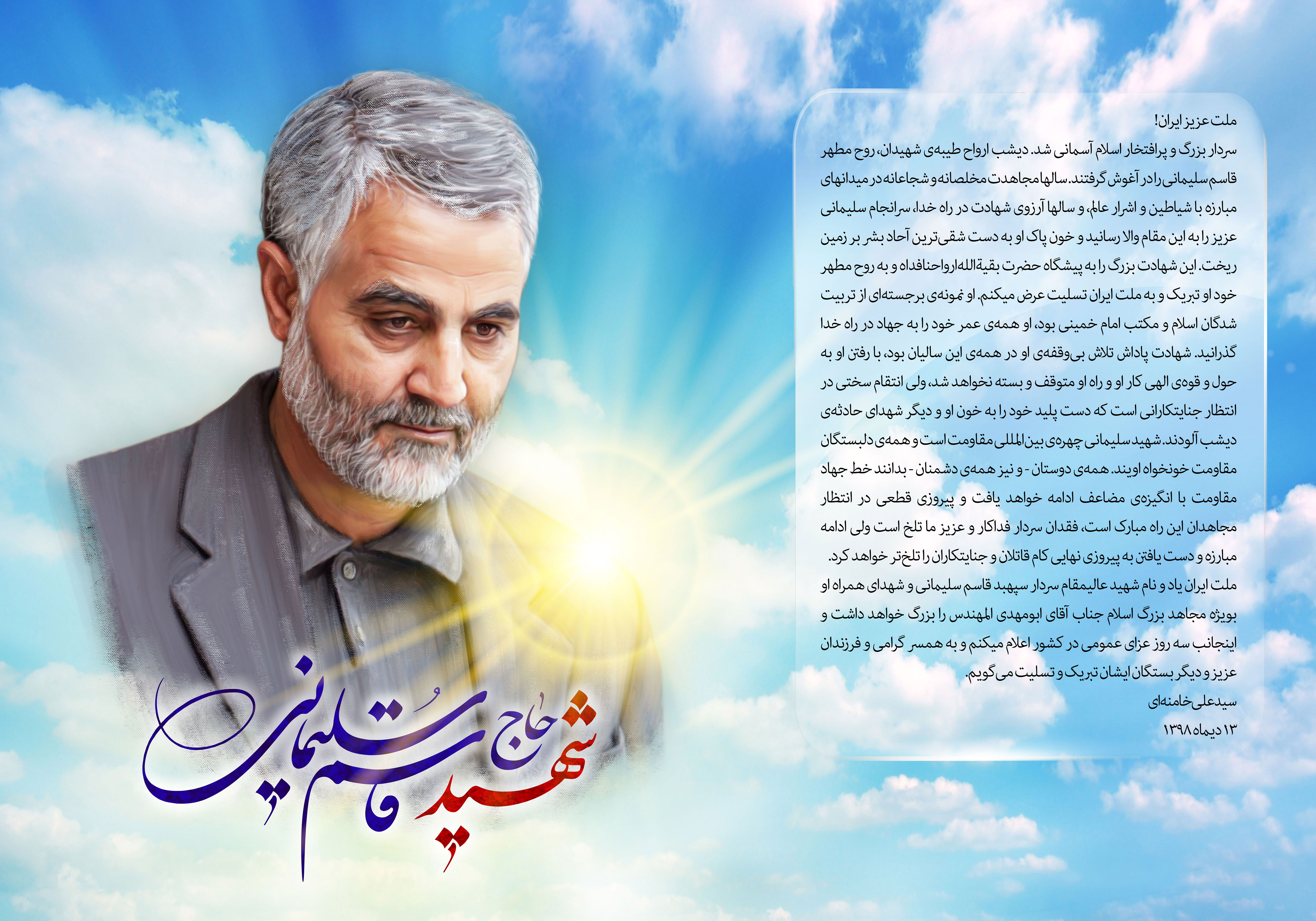 ملت ایران یاد و نام شهید عالیمقام سردار سپهبد قاسم سلیمانی و شهدای همراه او بویژه مجاهد بزرگ اسلام جناب آقای ابومهدی المهندس را بزرگ خواهد داشت و اینجانب سه روز عزای عمومی در کشور اعلام میکنم و به همسر گرامی و فرزندان عزیز و دیگر بستگان ایشان تبریک و تسلیت میگویم.
